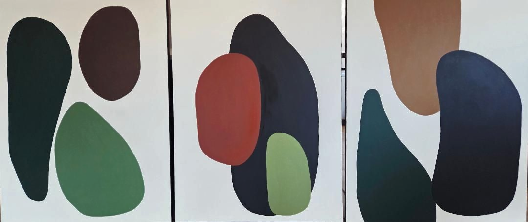 This mid century modern triptych original canvas brings together mid century modern and sbstract with black, green, camel, and rust colors. It is a large statement piece.