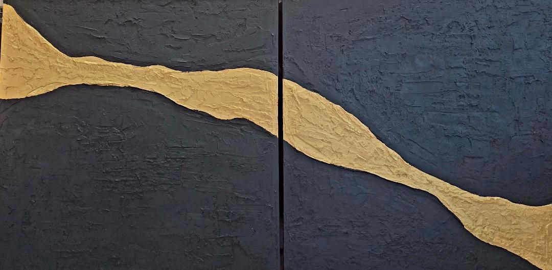 This stunning and highly textured diptych is the perfect addition to elevate the drama in any living space. Featuring a striking metallic gold line that contrasts beautifully against a sleek, flat black background, this artwork is designed to capture attention and spark conversation. The dynamic interplay between texture and color not only enhances the aesthetic appeal but also brings a sense of sophistication and modernity to your decor. Whether hung in a living room, bedroom, or office, this piece effortlessly adds a vibrant pop that transforms any wall into a stunning focal point. Experience the perfect blend of artistry and elegance with this captivating diptych.